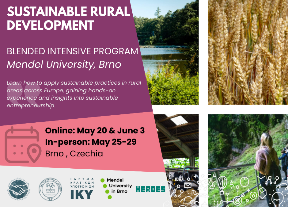 Mendel University in Brno warmly invites you to participate in the Blended Intensive Programme (BIP) on Sustainable Rural Development (BIP), hosted by the Faculty of AgriSciences. This unique programme combines short-term mobility for both online and physical components. The face-to-face sessions are scheduled from May 25 to 29, 2026, while the online sessions will be held on May 20, 2026 and June 3, 2026. Designed primarily for students, the programme also welcomes staff members to join.