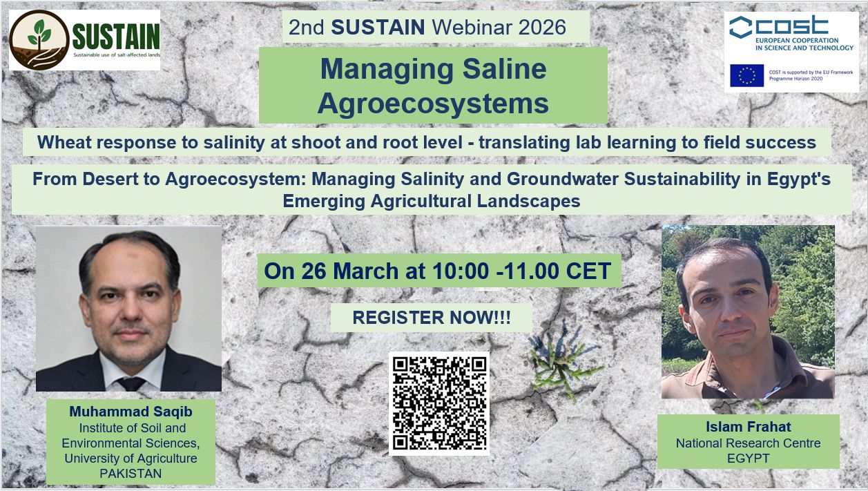 Excited to host the 2nd SUSTAIN COST Action Webinar on Food and fodder on saline soil – transfer into praxis. Meet the host Irene Christoforidi, the speakers Muhammad Saqib and Islam F. Hassan , PhD and register for the webinar: https://lnkd.in/dD97yeyU