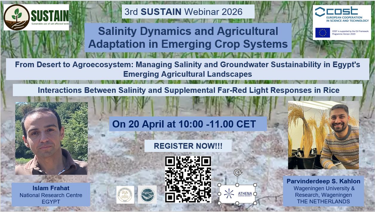 We are pleased to invite you to our upcoming 3nd Webinar within the SUSTAIN COST Action CA22144 (Sustainable use of Salt-affected Lands). The webinar on “Salinity Dynamics and Agricultural Adaptation in Emerging Crop Systems” will take place on 20 April 2026 at 10:00 CET.